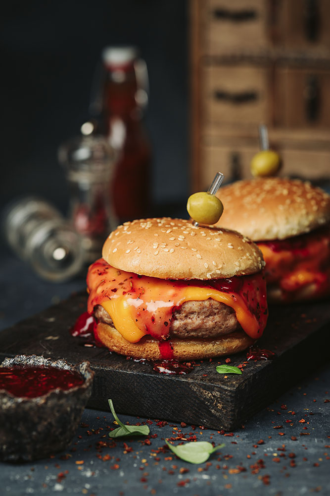 3/ Нанның төменгі бөлігін горчицамен майлап, үстіне ірімшік бар котлетті салыңыз. Үстіне вишня соусын құйып, жоғарғы нанмен жабыңыз.