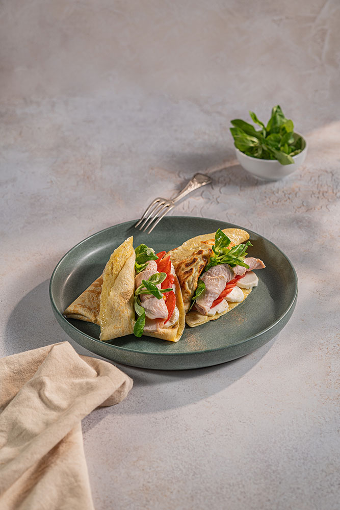 3/ Құймақтарды жартысына бүктеңіз. Әр құймақтың бір жартысына ірімшік, помидор және түркия филесінің тілімдерін салыңыз. Дәміне қарай тұз бен бұрыш қосып, жүгері салатымен безендіріңіз, содан соң жинап, әдемі қалта жасаңыз.