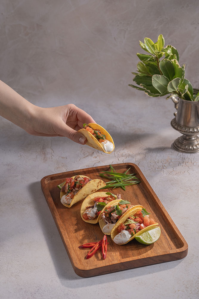 4/ Таколарды жинау: Әр тортильяға жіңішке туралған түркия етін, pico de gallo және лайм шырынын қосыңыз. Жағына қаймақ қосып, паприка себіңіз.